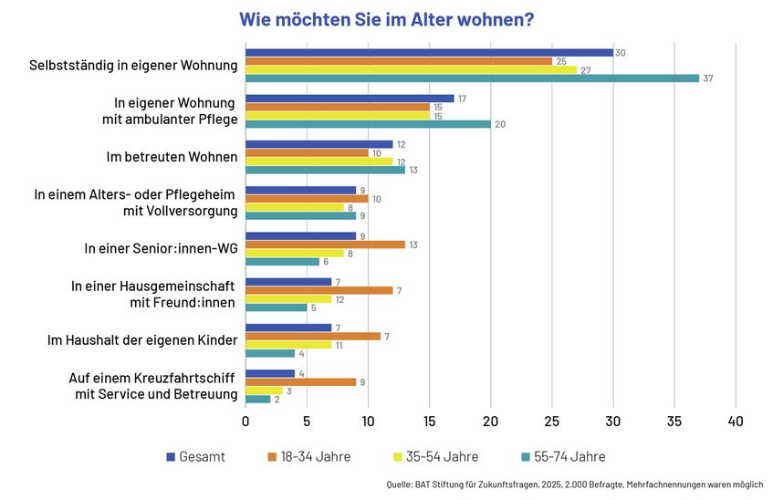 37 Prozent der 55- bis 74-Jährigen wünschen sich das, wie die Auswertung einer Befragung der BAT Stiftung für Zukunftsfragen zeigt. 20 Prozent stellen sich das Leben im Alter in der eigenen Wohnung, aber mit ambulanter Pflege vor, hinzu kommen sechs Prozent, die gern in einer Senior:innen-WG leben wollen und fünf Prozent wünschen sich eine Hausgemeinschaft mit Freund:innen.